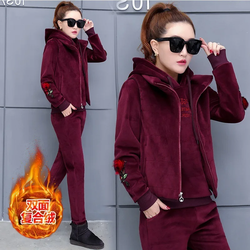 New Product Women Sport Suit Tracksuit Winter Thick Velour Warm Embroid Jacket Hoodie+coat+pant Casual Jogger R