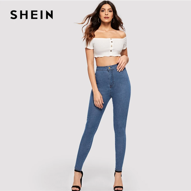 Cheap SHEIN Solid Skinny Jeans 2019 Spring Autumn Skinny Stretchy Jeans Blue Navy Woman Solid High Waist