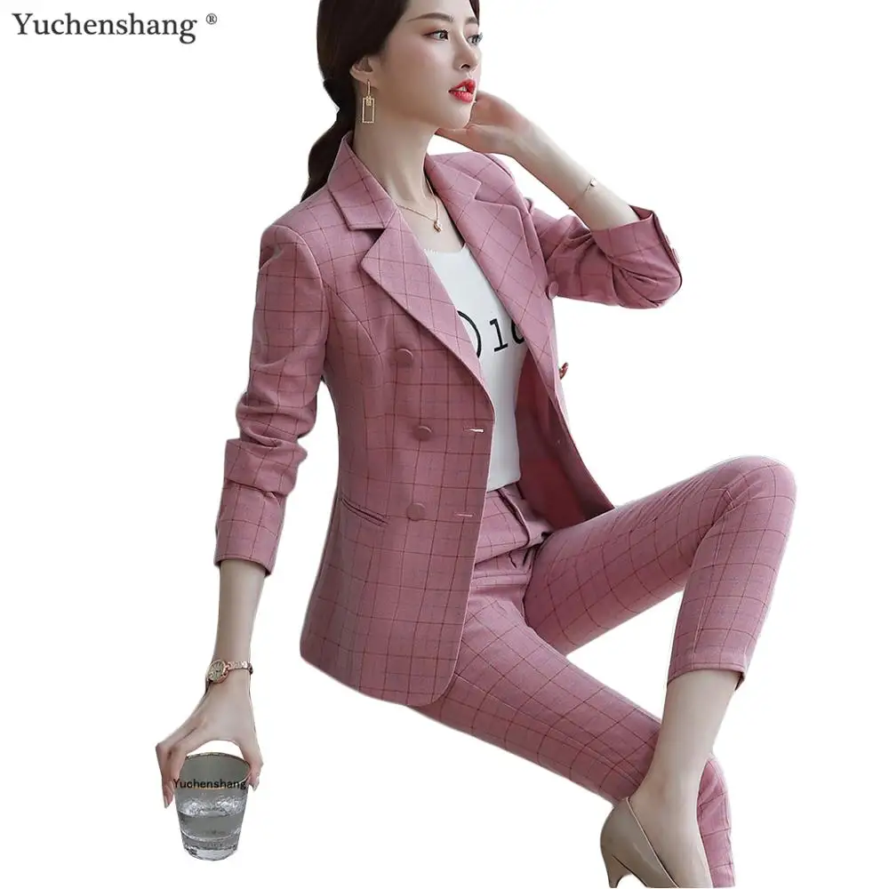 Free shipping 2019 Two Pieces Set Women Pink Brown Plaid Pant Suit Size S-5XL Plaid Jacket Blazer With Plaid Pant